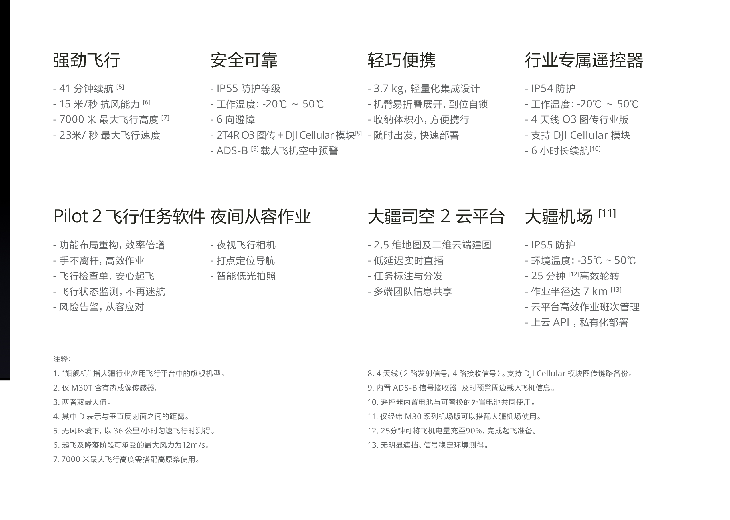 經緯M30系列無人機,集成廣角、變焦、熱成像及激光測距傳感器,輕巧便攜,風雨無阻,操作體驗升級,支持大疆司空2云平臺,高效空地協(xié)同,支持大疆首個機場,實現(xiàn)無人值守作業(yè)。機身結構精悍,動力系統(tǒng)強勁,帶來更高的作業(yè)效率。具備41分鐘續(xù)航,支持7000米海拔高度起飛,最大飛行速度23米/秒。無人機具備 IP55 防護等級,工作環(huán)境溫度范圍達 -20° C~50° C ,可輕松應對極端惡劣環(huán)境。整機搭載六向雙目及紅外傳感器,全方位避障,保障飛行安全。內置 ADS-B 信號接收器,可及時預警周邊載人飛機信息。經緯 M30 系列的飛行器系統(tǒng)和傳感器具備多重冗余系統(tǒng),讓你放心應對惡劣作業(yè)環(huán)境與重大任務,為不時之需做好準備。具體包括:飛控傳感 器冗余、感知系統(tǒng)冗余、動力系統(tǒng)雙鏈路冗余、雙智能電池冗余、圖傳鏈路冗余等。