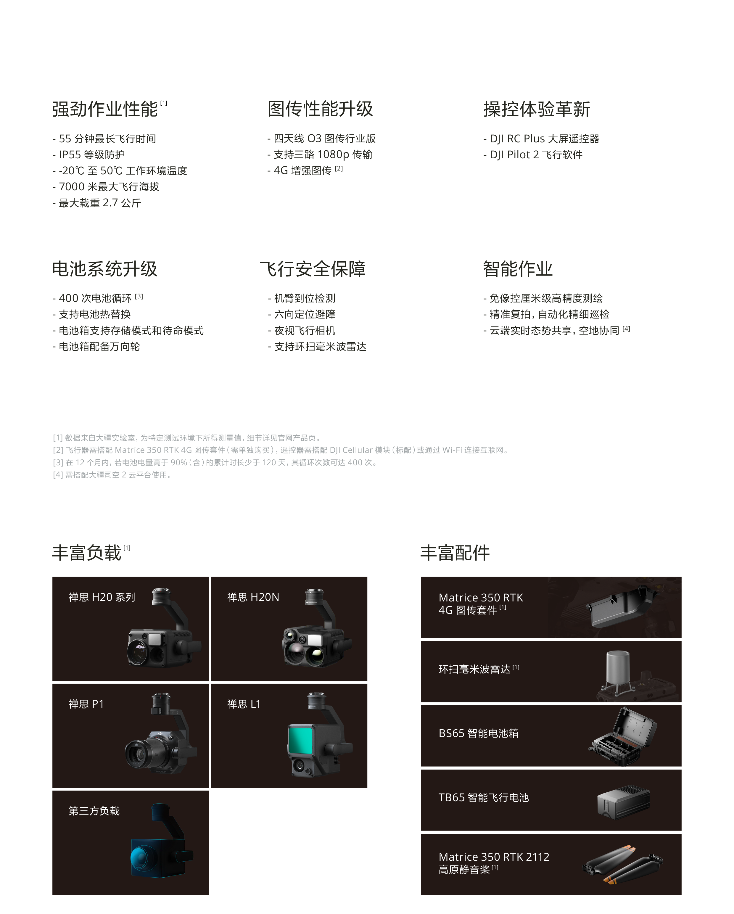 旗艦新升級,行業新高度。全新圖傳系統和操控體驗,更高效的電池系統,更全面的安全保障,以及強大的負載和拓展能力,讓新一代飛行平臺 Matrice 350 RTK 滿載實力,為空中作業注入革新力量。
