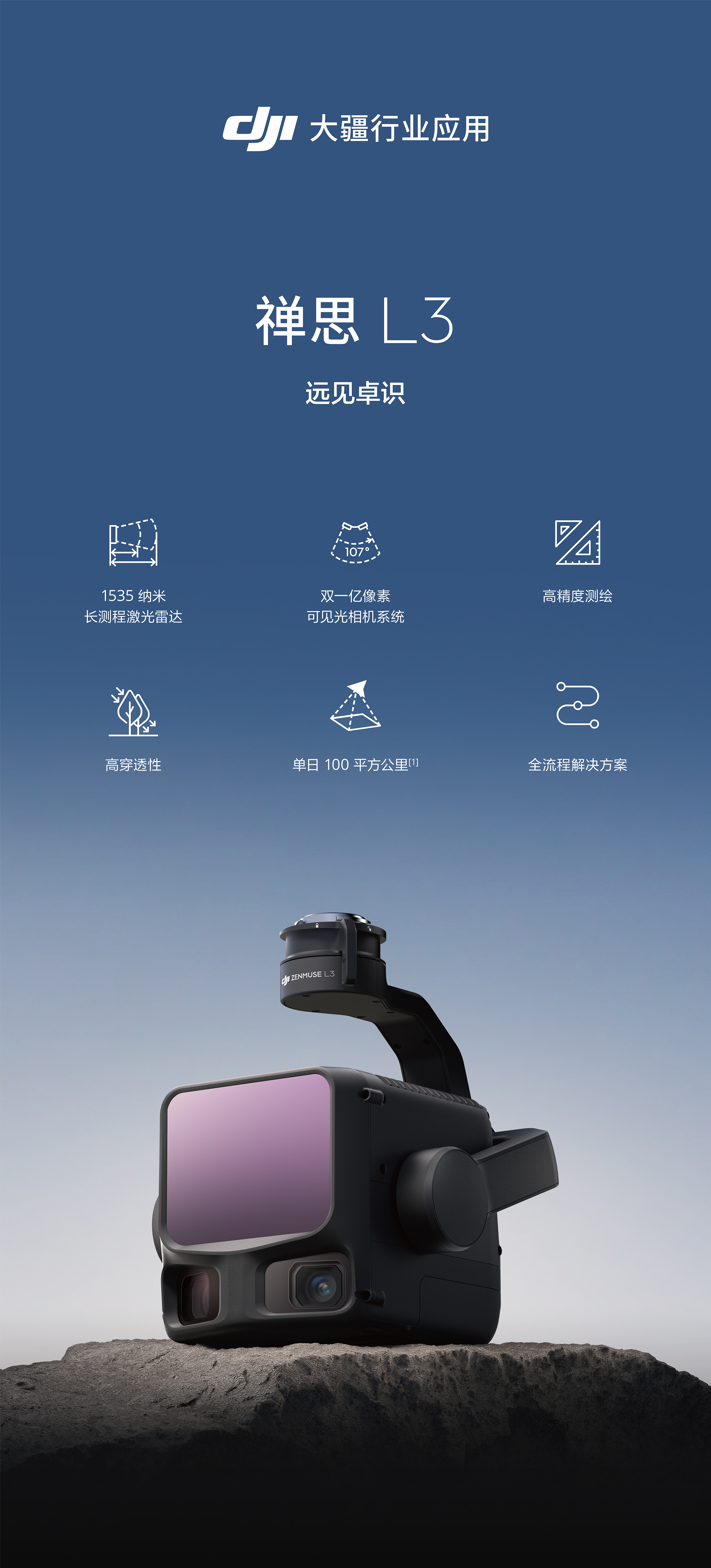 大疆新一代機載高精度航測激光雷達系統,配備長測程激光雷達,在10%的反射率下,最高測程可達950米。結合雙一億像素可見光相機及高精度位姿系統,禪思L3帶來更高效的三維數據采集,單日作業面積可達100平方公里。